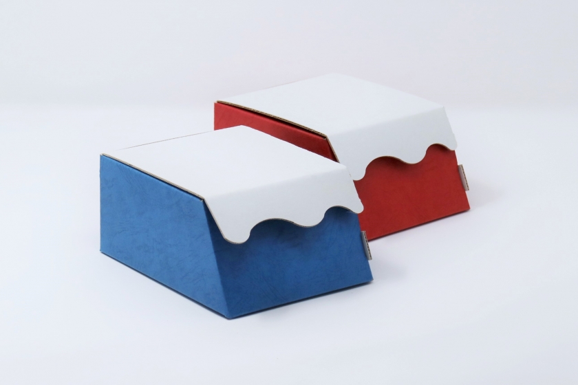 段ボールの風合いや裏表を活かした富士山の小箱です。素材感を大切にしたシンプルは形状です。赤・青の2色のシートで作成しました。