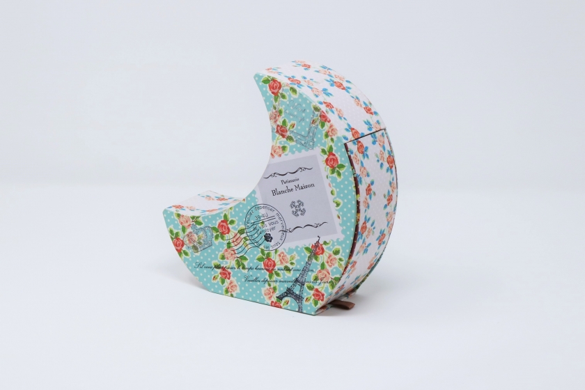 月の形の貼箱は自社でデザインをして中国で生産しています。複雑な形状も海外生産ならでは。目を引きやすい形状でインテリアとしても飾っておきたくなる箱です。